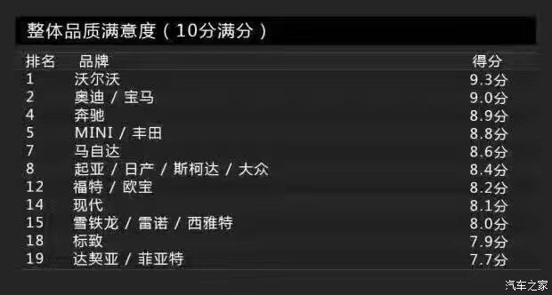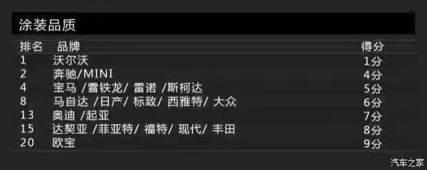 再來看看涂裝品質(zhì)方面,涂裝主要包括車漆亮度與耐腐蝕性。還是老規(guī)矩,得分最低就代表消費者滿意度最高(下同)。沃爾沃的得分為1分,依然占據(jù)榜首的位置,或許排名第二的奔馳為4分,但跟沃爾沃差距有點大。得分最高的則是歐寶,為9分。另外,達(dá)契亞也有8分。