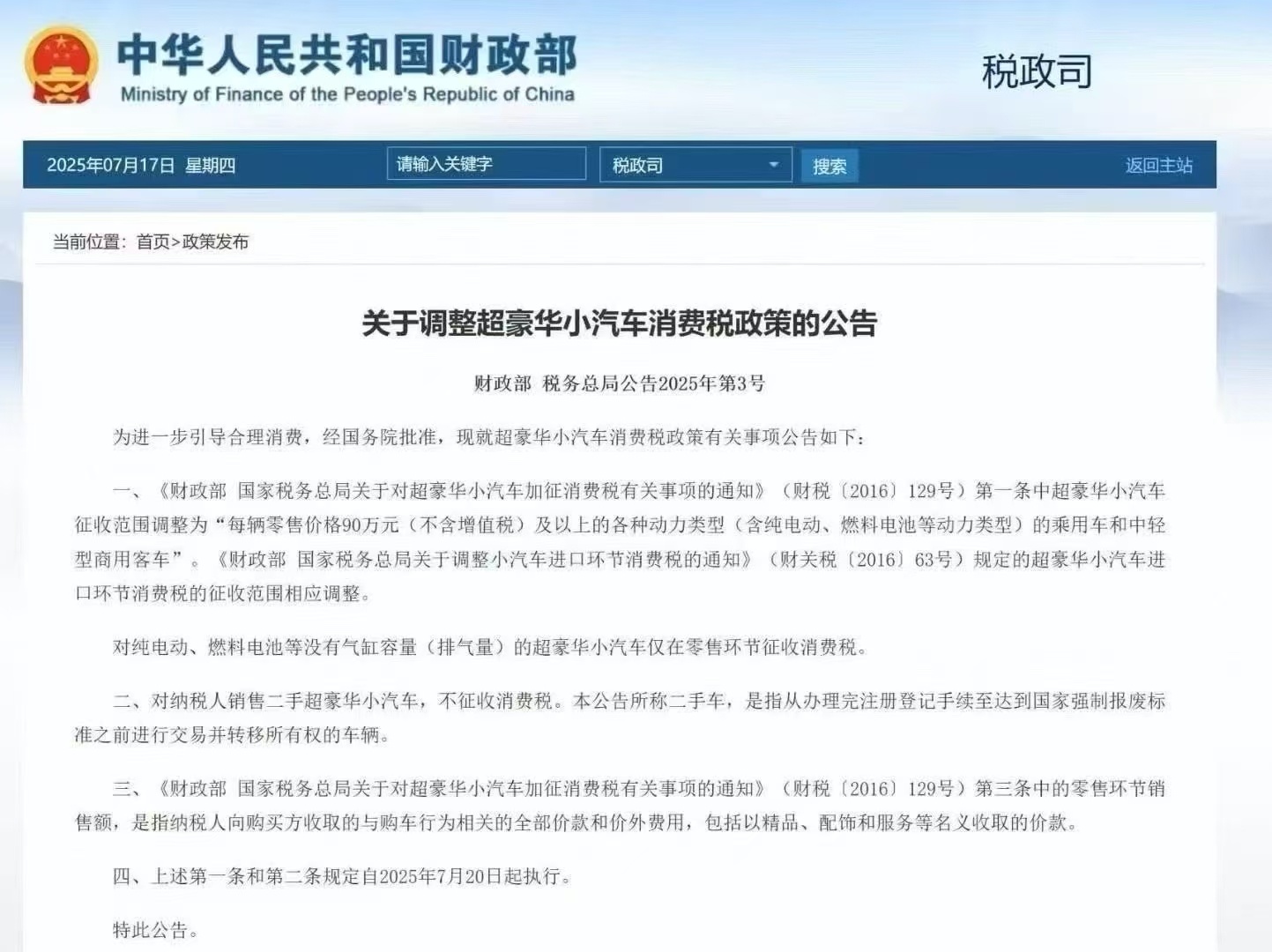(圖源:財政部官方網(wǎng)站) 新政聚焦四大調(diào)整 此次政策調(diào)整圍繞征稅范圍、計稅方式等核心問題展開,主要涉及四大變化: 首先,征稅門檻降至90萬元,更多豪華車被納入征稅范圍。 新政將超豪華小汽車消費(fèi)稅的征稅門檻從130萬元(不含增值稅)下調(diào)至90萬元(不含增值稅),意味著此前未被納入征稅范圍的90萬-130萬元區(qū)間車型,將開始繳納10%的消費(fèi)稅。以目前銷售的仰望U8、享界S800為例,這兩款車型隨著政策落地將需要繳納10萬元左右的消費(fèi)稅。 不過,乘聯(lián)會秘書長崔東樹指出,該政策影響的市場規(guī)模較小,僅占市場總量的千分之一到千分之二,對整體汽車市場的沖擊有限。 其次,新能源車征稅優(yōu)勢顯著,燃油車仍需雙重繳稅。 新政策對不同動力類型車型的征稅規(guī)則做出區(qū)分:純電動、燃料電池等無氣缸容量的超豪華車,僅需在零售環(huán)節(jié)繳納10%消費(fèi)稅;而傳統(tǒng)燃油車需在生產(chǎn)(進(jìn)口)和零售環(huán)節(jié)雙重繳稅——生產(chǎn)環(huán)節(jié)按排量征收1%-40%,零售環(huán)節(jié)再加征10%。 以不含稅價100萬元的車型為例:純電動車僅需繳納10萬元消費(fèi)稅;同價位3.0升燃油車則需在生產(chǎn)環(huán)節(jié)繳納25萬元、零售環(huán)節(jié)繳納10萬元,總計35萬元的稅費(fèi)。這一差異使得同價位新能源車的購車成本顯著低于燃油車。 第三,新政首次明確二手超豪華車交易免征消費(fèi)稅。 中國汽車流通協(xié)會副會長羅磊向央廣網(wǎng)記者表示,此前部分地區(qū)(如深圳、成都)曾對130萬以上的二手超豪華車征收交易稅,此次政策明確后,將消除重復(fù)征稅的顧慮。 第四,明確零售環(huán)節(jié)銷售額計算范圍,涵蓋全部相關(guān)費(fèi)用。 政策明確,零售環(huán)節(jié)銷售額指納稅人向購買方收取的與購車相關(guān)的全部價款和價外費(fèi)用,包括以精品、配飾、服務(wù)等名義收取的費(fèi)用。這一規(guī)定避免了企業(yè)通過拆分收費(fèi)規(guī)避繳稅的行為。 超豪華市場暫未波動 新政公布后第二天,央廣網(wǎng)記者在花鄉(xiāng)二手車市場走訪發(fā)現(xiàn),超豪華小汽車交易暫未出現(xiàn)明顯波動,二手車商普遍認(rèn)為,受新車銷售端接下來優(yōu)惠政策不確定性影響,新政策可能對超豪華二手車的交易刺激作用有限。但有專家向央廣網(wǎng)記者表示,后續(xù)市場可能迎來變化。 部分二手車商告訴央廣網(wǎng)記者,超豪華新車落地價因征稅增加可能推高二手車收購價格。例如,奔馳S450此前優(yōu)惠后落地價約120萬元,新政實施后需額外承擔(dān)13%的稅費(fèi),落地價升至130萬元左右;新車成本上升將帶動同車型二手車收購價上漲,進(jìn)而推動二手車售價提高。不過,若車企通過優(yōu)惠補(bǔ)貼承擔(dān)部分稅費(fèi),對消費(fèi)者落地價的影響可能縮小,二手車價格漲幅也會相應(yīng)受限。