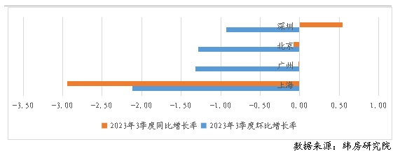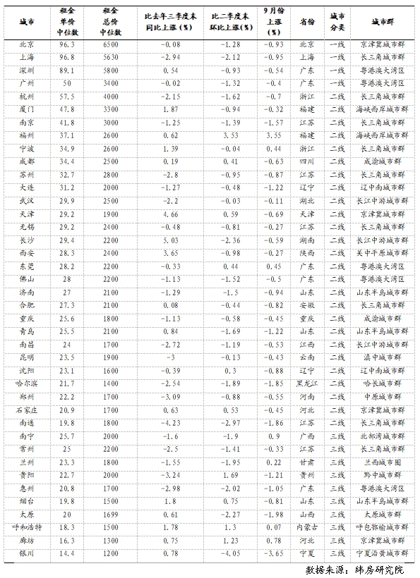 一線城市住房租金掛牌價(jià)普遍下跌 一線城市住房租金表現(xiàn)不及預(yù)期,呈普遍下跌態(tài)勢。除深圳住房租金同比略有上漲外,其他一線城市住房租金環(huán)比和同比均呈下降態(tài)勢。其中,上海跌幅最大。與二季度末相比,上海三季度住房租金下跌2.12%;與去年三季度末相比,住房租金下跌2.94%。北京和廣州三季度住房租金也環(huán)比下跌,跌幅分別達(dá)到1.28%和1.32%。與去年三季度末相比,兩城住房租金雖略有下降,但基本與去年持平。深圳三季度住房租金也環(huán)比下降,跌幅為0.93%。 圖3 一線城市住房租金變動(dòng)情況