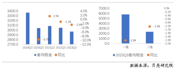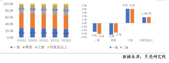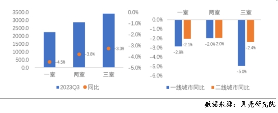 三季度全國重點(diǎn)40城三居室租金支出同比跌幅最大 分不同居室來看,全國重點(diǎn)40城中一居室占比同比下跌4.5%,同比跌幅最大;分不同能級(jí)城市來看,一線、二線城市三居室套均租金同比跌幅最大,其次為一居室。 圖12 2023年三季度重點(diǎn)40城及不同能級(jí)城市不同戶型套均支出變化