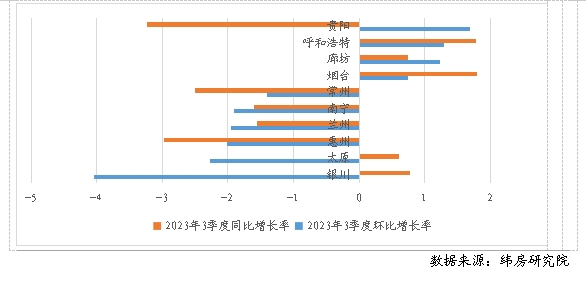 三季度住房租金掛牌價(jià)整體呈下降趨勢 緯房研究院數(shù)據(jù)顯示,重點(diǎn)40城中,僅有10個(gè)城市住房租金環(huán)比上升,其余30個(gè)城市住房租金均環(huán)比下降。其中,租金上漲的城市增幅也并不可觀,環(huán)比增長率大多不到1%。租金下跌的30城中,12個(gè)城市租金跌幅在1%以內(nèi),12個(gè)城市跌幅在1%-2%之間,6個(gè)城市跌幅超過2%。與2022年三季度末相比,重點(diǎn)40城中16個(gè)城市住房租金同比上漲,24個(gè)城市同比下降。其中,3個(gè)城市同比增長超過2%,13個(gè)城市同比漲幅在2%以內(nèi),12個(gè)城市同比跌幅在2%以內(nèi),11個(gè)城市同比跌幅在2%-4%之間,1個(gè)城市同比跌幅超過4%。 圖2 2023年三季度重點(diǎn)40城住房租金漲跌情況