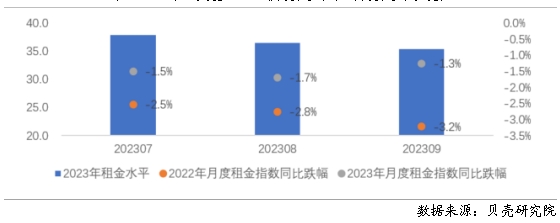(二)租金成交價(jià)水平同比下跌,環(huán)比微漲 租金成交價(jià)水平同比下跌,相較于去年,7-9月月度租金同比跌幅縮小 在國家政策支持下,保障性租賃住房、市場化租賃項(xiàng)目陸續(xù)入市,再加上個(gè)人業(yè)主“售轉(zhuǎn)租”房源增加,全國重點(diǎn)40城租金水平保持同比下跌。根據(jù)貝殼研究院數(shù)據(jù),三季度全國重點(diǎn)40城月度租金水平為36.6元/平米,環(huán)比微漲0.8%,同比下跌4.2%,為近五年最低值。從月度同比來看,7、8、9月月度租金指數(shù)分別同比下跌1.5%、1.7%、1.3%,相比于去年同期的月度同比跌幅均縮小了1個(gè)百分點(diǎn)。從月度環(huán)比來看,7月、8月租金指數(shù)環(huán)比微漲1.0%、0.2%,9月環(huán)比下跌0.5%。 圖6 2023年三季度重點(diǎn)40城月度租金水平及月度租金指數(shù)變化