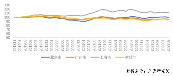 核心觀點(diǎn) 政策:行業(yè)監(jiān)管體系趨于完善,資金監(jiān)管、信用信息管理、從業(yè)人員實(shí)名及信用管理等政策陸續(xù)出臺(tái)。保障性租賃住房的配套政策仍是重點(diǎn),政策涉及稅費(fèi)減免、建設(shè)標(biāo)準(zhǔn)優(yōu)化、非改租、產(chǎn)業(yè)園區(qū)配套用地建設(shè)保障性租賃住房等。政策繼續(xù)優(yōu)化公積金提取用于租房,加大對(duì)租賃融資支持,同時(shí)推動(dòng)保障性租賃住房REITs的常態(tài)化發(fā)行。 行業(yè):市場主體保持較高的活躍度,保障性租賃住房供應(yīng)快速增加,保障性租賃住房運(yùn)營企業(yè)積極籌備REITs發(fā)行。同時(shí),市場化租賃領(lǐng)域,新項(xiàng)目、新品牌陸續(xù)推出,企業(yè)主要聚焦在擴(kuò)大房源管理規(guī)模,同時(shí)融資方面多渠道發(fā)力。 市場:今年三季度全國重點(diǎn)40城市場活躍度同比提升,高校畢業(yè)生租賃需求增加、推遲購房人群“購轉(zhuǎn)租”的租賃需求增加,推高了住房租賃市場活躍度。租金上漲動(dòng)能總體不足,租金低于去年同期水平,一線城市同比跌幅高于二線城市。 展望:在季節(jié)性因素的影響下,四季度租賃市場活躍度將環(huán)比下降,考慮到“購轉(zhuǎn)租”帶來租賃需求增加,再加上去年租賃市場活躍度較低,預(yù)計(jì)今年四季度市場活躍度要高于去年,租金水平環(huán)比、同比將保持穩(wěn)中有降的趨勢。 一、2023年三季度住房租金變動(dòng)情況 (一)住房租金掛牌價(jià)環(huán)比下降,且低于去年同期水平 租金上漲動(dòng)力不足,三季度住房租金掛牌價(jià)水平環(huán)比下降,且低于去年同期水平 住房大數(shù)據(jù)監(jiān)測系統(tǒng)核心40城住房租金指數(shù)顯示,2023年三季度末重點(diǎn)40城住房租金指數(shù)為100.06(2018年1月為100),相對(duì)于二季度末(定基指數(shù)101.06)下降0.99%。與去年三季度末相比,住房租金水平下跌了0.66%。分月份來看,7月份受到高校畢業(yè)生租房需求增加的影響,住房租金水平微漲,環(huán)比增長0.25%。但畢業(yè)需求并未對(duì)住房租賃市場帶來持續(xù)的熱度,8月和9月住房租金止?jié)q轉(zhuǎn)跌,環(huán)比分別下降0.55%和0.68%。 圖1 重點(diǎn)40城住房租金綜合指數(shù)