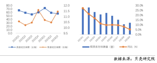 二、2023年三季度租賃住房成交量變化 住房租賃市場活躍度整體有所提升 相比于去年同期,全國重點(diǎn)40城租賃市場活躍度提升。根據(jù)貝殼研究院數(shù)據(jù),今年三季度全國重點(diǎn)40城成交量環(huán)比、同比增加均超過10%,租賃市場活躍度環(huán)比、同比均呈現(xiàn)上升趨勢。今年高校畢業(yè)生數(shù)量創(chuàng)新高,達(dá)到1158萬人,畢業(yè)生群體帶來較強(qiáng)的租賃需求,再加上推遲購房人群“購轉(zhuǎn)租”的租賃需求增加,使得整體租賃需求保持旺盛。從月度來看,全國重點(diǎn)40城租賃市場熱度在7月、8月達(dá)到市場熱度峰值,7月、8月租賃成交量基本持平,并超過去年月度峰值。租賃市場9月進(jìn)入到傳統(tǒng)市場淡季,9月租賃成交量環(huán)比減少。 租賃房源出租速度同比減緩 根據(jù)貝殼研究院數(shù)據(jù),全國重點(diǎn)40城三季度房客源成交周期分別為56.7、11.5天,房源成交周期環(huán)比減少2.1天,同比增加2.7天;客源成交周期環(huán)比延長1天,同比延長1天。隨著個(gè)人租賃房源供應(yīng)的增加,疊加保障性租賃住房、市場化集中式租賃房源的增加,個(gè)人業(yè)主出租房源出租速度減緩。從庫存房源來看,今年1-9月租賃庫存房源量均呈現(xiàn)同比增加的趨勢,與此同時(shí),租客租房面臨的選擇項(xiàng)增多,租客對(duì)于租賃房源可選類型和房源量均有增加。 圖10 重點(diǎn)40城房客源成交周期變化(左)、租賃庫存房源量及同比變化(右)