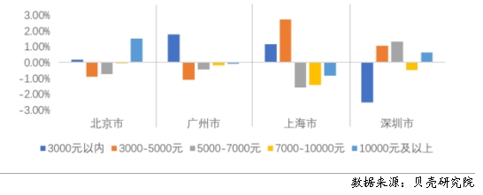 一線城市呈現(xiàn)重心下移和延遲購房“購轉(zhuǎn)租”的特征 貝殼研究院數(shù)據(jù)顯示,一線城市呈現(xiàn)不同程度的重心下移,同時(shí)北京、深圳還呈現(xiàn)出延遲購房“購轉(zhuǎn)租”的特征,高套均支出區(qū)間的租賃房源成交增加。上海和廣州租賃重心下移態(tài)勢明顯。上海套均租金5000元以內(nèi)的成交占比增加了將近4個(gè)百分點(diǎn),5000元以上的占比均呈現(xiàn)減少趨勢,尤其是套均租金在5000-10000元區(qū)間的房源占比;廣州套均租金在3000元以內(nèi)的增加了1.8個(gè)百分點(diǎn),3000元以上的均呈現(xiàn)減少趨勢。 北京和深圳還呈現(xiàn)出延遲購房“購轉(zhuǎn)租”特征。一線城市中北京租賃成交套均租金“高低兩端”的占比有所增加,其中套均租金10000元以上的占比增加了1.5個(gè)百分點(diǎn),10000元以上主要以家庭租賃需求為主。深圳則是套均租金3000-7000元占比增加了2.4個(gè)百分點(diǎn),3000元以內(nèi)的占比減少了2.5個(gè)百分點(diǎn),深圳3000元以內(nèi)的租賃需求部分轉(zhuǎn)移至城中村房源,而對(duì)于套均租金3000元以上租賃需求普遍增加,多為延遲購房“購轉(zhuǎn)租”家庭型租賃需求。 圖14 2023年三季度一線城市不同價(jià)格段占比的同比變化
