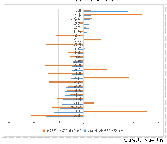 二線城市三季度住房租金掛牌價(jià)總體下降,少數(shù)城市租金微漲 住房大數(shù)據(jù)監(jiān)測的26個(gè)二線城市中,僅有6個(gè)城市的住房租金環(huán)比上漲,20個(gè)城市的住房租金環(huán)比下跌。其中,南通和長沙降幅最高,分別為2.97%和2.36%,其余城市降幅均不超過2%;福州漲幅最高為3.53%,其余城市漲幅均不超過1%。與2022年三季度末相比,住房大數(shù)據(jù)監(jiān)測的26個(gè)二線城市中有16個(gè)城市住房租金同比下降,10個(gè)城市住房租金同比上漲。其中,南通、鄭州、昆明等城市住房租金同比跌幅最大,分別下跌4.23%、3.09%和3%;長沙、天津、西安等城市住房租金同比漲幅最大,分別上漲5.03%、4.66%和3.65%。 圖4 二線城市住房租金變動(dòng)情況