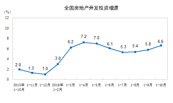 2016年1-10月份,全國房地產(chǎn)開發(fā)投資83975億元,同比名義增長6.6%,增速比1-9月份提高0.8個百分點。其中,住宅投資56294億元,增長5.9%,增速提高0.8個百分點。住宅投資占房地產(chǎn)開發(fā)投資的比重為67.0%。