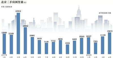據(jù)我愛我家集團(tuán)市場研究院統(tǒng)計,4月北京二手住宅共網(wǎng)簽13673套,同比2017年4月下滑19.1%,環(huán)比2018年3月上升22.6%。雖然同比仍在下降,但4月的二手房網(wǎng)簽量是去年5月至今12個月里的最高值。