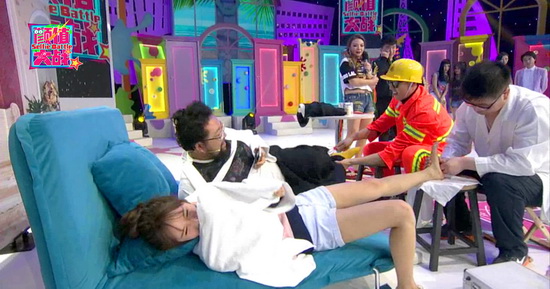 更悲慘的還在后面等著修睿。原地做造型自拍都困難無比,身子完全掌握不到平衡,直接踹翻道具椅,颶風(fēng)碉堡更是變成一座阻擋他前進(jìn)的大山,一步兩步往前跳,努力自拍擺造型,無奈實在抵擋不住勁風(fēng),直接單膝跪地整個人撲倒。和美女體驗情景自拍,抽到“撲倒與被撲倒”,被搭檔嫌棄還要忍受撓腳心的煎熬,拍出驚悚照被張大大、小甜甜一陣暴風(fēng)吐槽。而喬杉則和一貫的老搭檔小甜甜再度演繹情景,兩人同吃小香腸自拍,一邊喬杉被撓腳心哭笑不得,氣得搶下按摩器直敲“按摩師”。