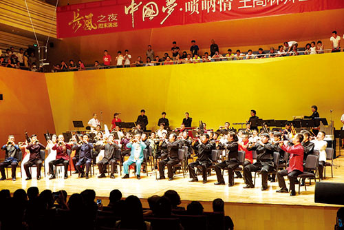 本報(bào)訊 嗩吶悅耳、笙簫婉轉(zhuǎn),一曲吹打樂《大得勝》直擊觀眾心扉;60多名演奏成員配合默契、技藝高超,贏得觀眾陣陣掌聲。6月17日晚,由山西省文化廳、山西大劇院主辦,山西演藝集團(tuán)歌舞劇院民族樂團(tuán)演出的“長風(fēng)之夜”文化惠民活動(dòng)——“《中國夢·嗩吶情》王高林師生嗩吶音樂會(huì)”在山西大劇院音樂廳精彩奏響。