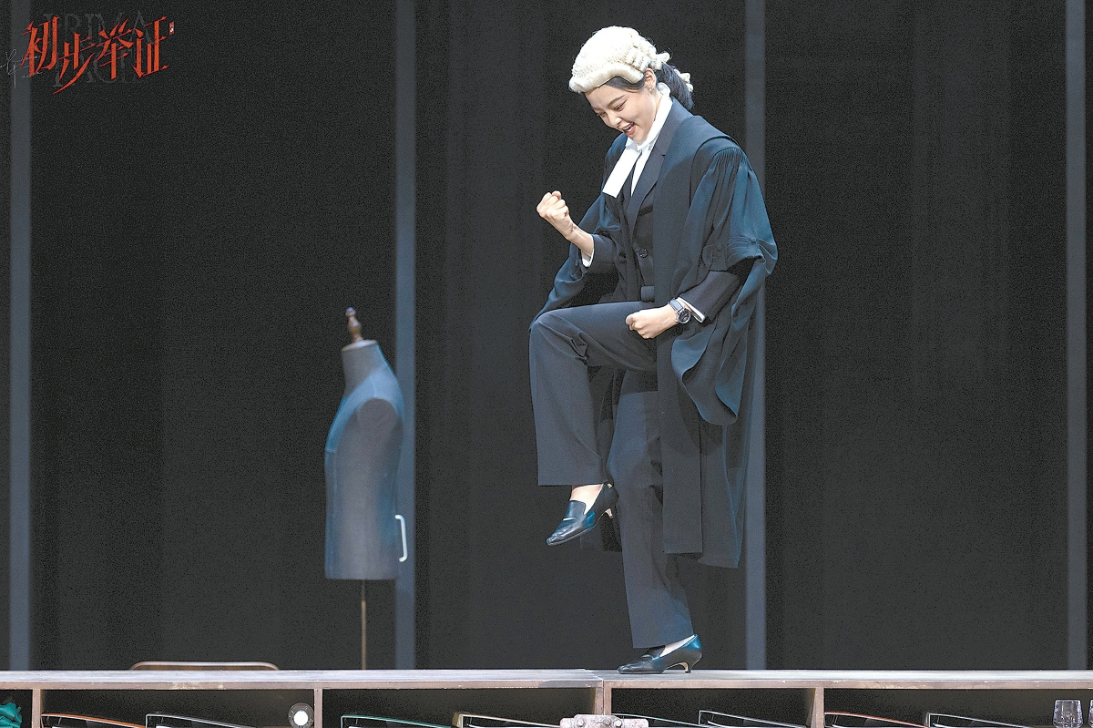 舞臺極為對稱。最醒目的,是兩側(cè)微微斜切向后景的賽馬欄。如果從上方俯視,賽馬欄將舞臺空間變成了一個等邊梯形,中央橫放著長長的組合式開架矮桌柜。這是由蘇西·米勒編劇、周可導演的獨角戲《初步舉證》中文版的現(xiàn)場。從大空間布局上看,中文版與2022年4月英國NTlive版有一定相似性。但舞臺布景的差異,還是顯示出導演不同的側(cè)重點。NTlive版以三面巨大的、裝滿卷宗的書柜構(gòu)成了半包圍式舞臺結(jié)構(gòu),舞臺中央是兩張大辦公桌。這一偏于寫實的布景突出了主角的律師身份,既富專業(yè)性,又有無形的壓迫感。中文版的賽馬欄則暗示庭辯仿佛賽馬,突出了律師爭當“第一名”的渴望。從觀眾席望去,對稱的舞臺呈現(xiàn)出一種均衡和穩(wěn)定。演出開始后,伴隨有轉(zhuǎn)臺功能的矮桌柜的一次次旋轉(zhuǎn),主人公以她失衡的人生告訴觀眾:有些事情必須改變。