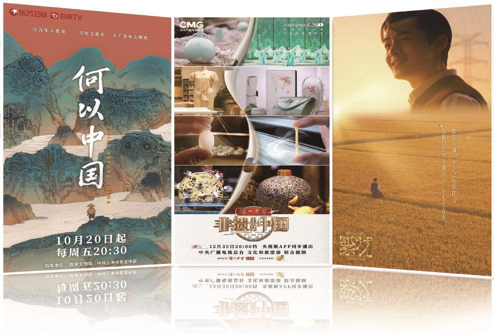 左起依次為《何以中國》《非遺里的中國》《繁花》海報。