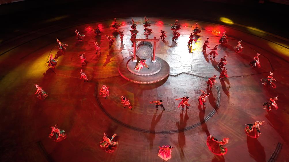 9月20日晚,演員在貴州省雷山縣大塘鎮(zhèn)表演苗族歌舞詩劇《仰歐桑》(無人機照片)。新華社記者 楊文斌 攝