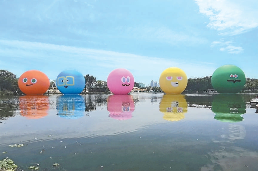近日,朝陽公園北碼頭附近的湖面上新添五個(gè)10米高的充氣大球,粉色、黃色、綠色等不同顏色,對應(yīng)的是樂隊(duì)組合五月天的不同成員,也與今年7月25日至8月9日,五月天在鳥巢舉辦演唱會的舞臺裝置遙相呼應(yīng)。與此同時(shí),樂隊(duì)成員的人物公仔也分別放置在居庸關(guān)長城、首鋼園、鼓樓廣場、798·751藝術(shù)區(qū)、亮馬河畔等地標(biāo)景點(diǎn)。