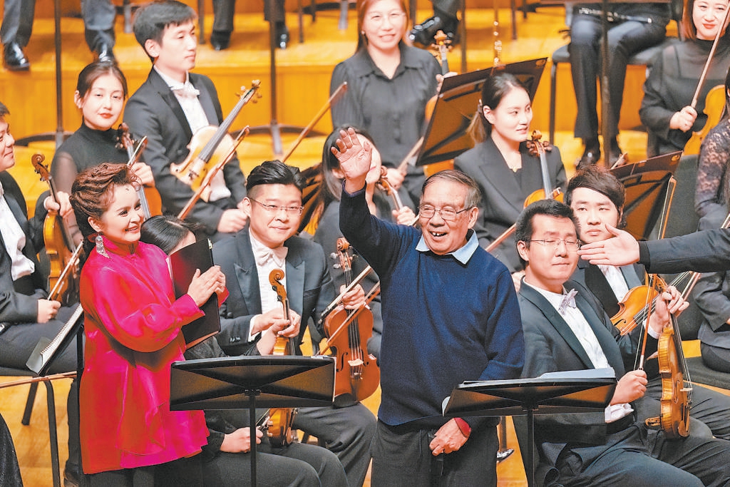 音樂會(huì)尾聲,作曲家鮑元愷(中)登臺(tái)向觀眾揮手致意。