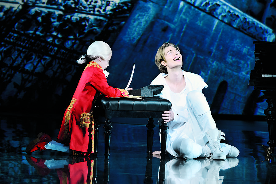 《莫扎特!》里的“另一個(gè)自我”卻不一樣,這個(gè)默默的小莫扎特既貫穿始終,又十分乖巧,基本上不去打擾主人公,絲毫不在聲音上影響這部歌曲極密的音樂劇的呈現(xiàn),卻能給觀眾留下更難以磨滅的印象?!澳男∧亍北緛砜赡苤皇侵鲃?chuàng)不得已采用的辦法,因?yàn)閮和輪T不大可能每晚演出,經(jīng)常要換人——上海的演出就是請(qǐng)了上海的孩子,很難要他們說或唱復(fù)雜的臺(tái)詞和唱段,所以干脆讓他們演啞劇。這個(gè)辦法似乎歪打正著,反而產(chǎn)生了舞臺(tái)上最好的效果。