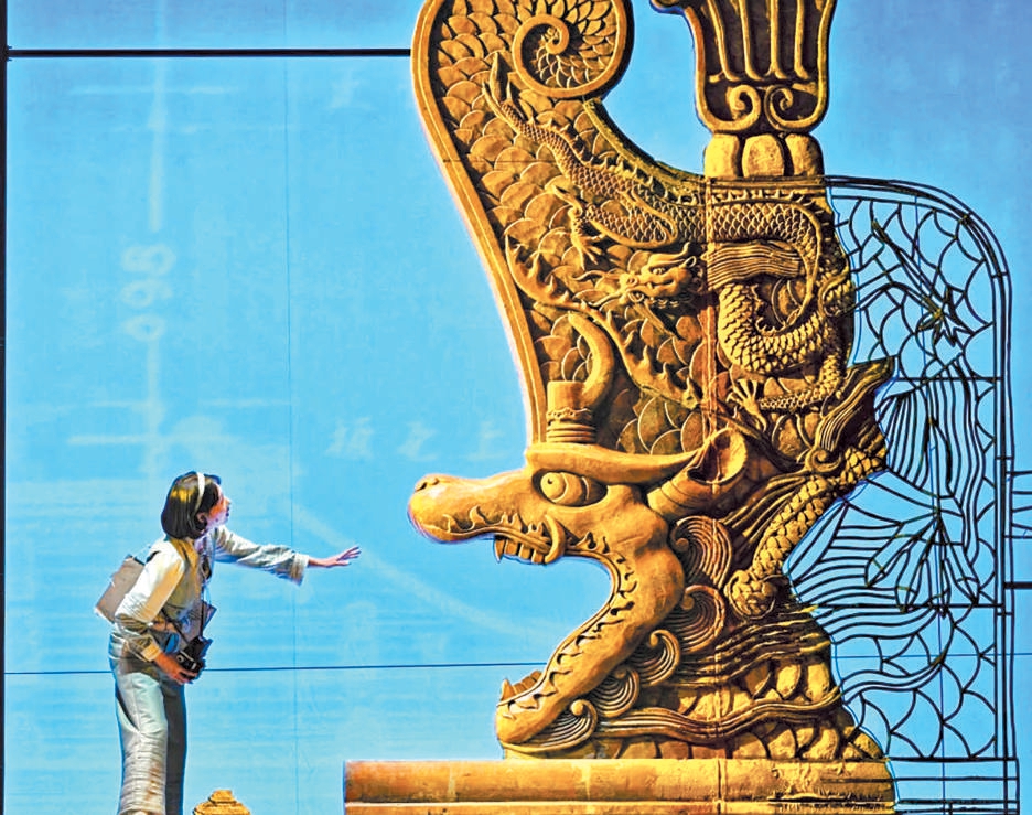 王琛透露,舞臺上關(guān)鍵的古建筑構(gòu)件均嚴(yán)格按照1∶1的真實比例復(fù)原制作,當(dāng)它們懸置于觀眾面前,一種視覺上的“沖擊力”油然而生,“觀眾能直觀體會到劇中人物每日工作的物理尺度和精神重量,體會測繪隊員是以怎樣的血肉之軀攀爬、丈量并挽留這份巍峨的文明?!蔽枧_地面,北平時期中軸線的建筑脈絡(luò)化為起伏線條,如紙張般弧形掀起,“寓意著古城文明在戰(zhàn)火中飄搖欲飛卻又根基深植的命運(yùn)。建筑的‘實’代表文明遺產(chǎn),圖紙的‘虛’代表傳承意志,虛實明暗的銜接過渡,共同凝固了那段驚心動魄的歷史?!保ㄓ浾?高倩)