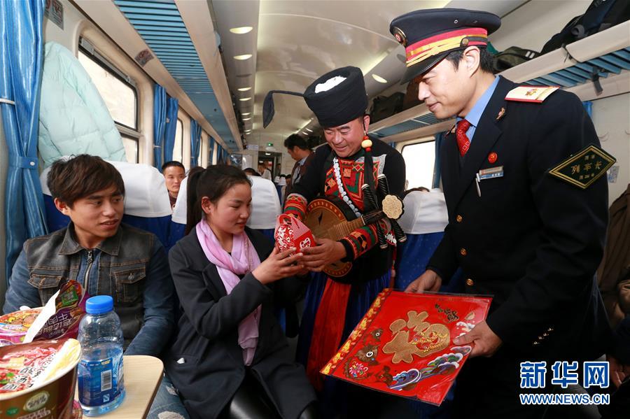 2月1日,彝族藝術(shù)家在K165次列車上為旅客表演。當日,在西安鐵路局西安至昆明的K165次列車上,四川美姑縣原生態(tài)畢摩樂隊與西安客運段職工民樂小分隊聯(lián)合舉辦“英雄列車民族之聲親情溫暖回家路”音樂會,畢摩樂隊用口弦、哈門、木葉、瑪布等彝族民間樂器演奏的音樂為返鄉(xiāng)過年的旅客提前送上新年祝福。民間藝術(shù)家和列車乘務員還為旅客們送上“?!弊帧⒋郝?lián)。新華社發(fā)