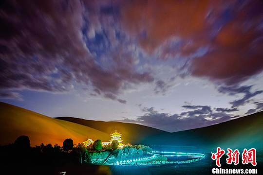 7月中旬,國際旅游名城甘肅敦煌進(jìn)入旅游旺季,每天成千上萬的海內(nèi)外游客來到當(dāng)?shù)刂Q沙山月牙泉景區(qū)觀光游覽,觀賞大漠風(fēng)光,感受敦煌文化,體驗(yàn)民俗風(fēng)情。傍晚時(shí)分,西邊的天空被晚霞染紅,美麗的月牙泉被寶藍(lán)色的燈光點(diǎn)綴著呈現(xiàn)出美輪美奐的闌珊夜色,大批游人沉浸于如夢如幻的迷人夜色里流連忘返。