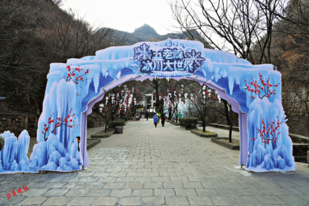 五老峰景區(qū)錦繡谷,工作人員借助天然溪流形成的冰掛加以人工造冰造型,按照生態(tài)環(huán)保和藝術創(chuàng)意要求,打造出長約1公里、單體高3米至10米的彩色冰掛,極具視覺沖擊力。一條條冰掛或垂于崖壁,或懸于樹枝,晶瑩剔透,壯觀雄渾。滿目的玉樹瓊花、銀峰玉柱形成一幅霧凇冰掛奇景,讓人仿佛置身于童話世界。