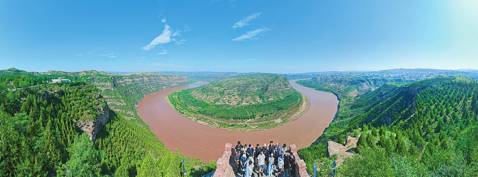 8月19日,游客在永和縣乾坤灣景區(qū)游覽觀光、合影留念。近年來,該縣不斷提高當(dāng)?shù)厣指采w率,并依托紅色旅游資源發(fā)展文旅經(jīng)濟(jì),把東征村156孔窯洞改造成民宿旅館,增加了村集體和村民收入。