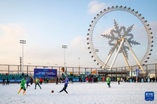 2025年12月20日,參賽球員在哈爾濱冰雪大世界參加大眾雪地足球挑戰(zhàn)賽。
