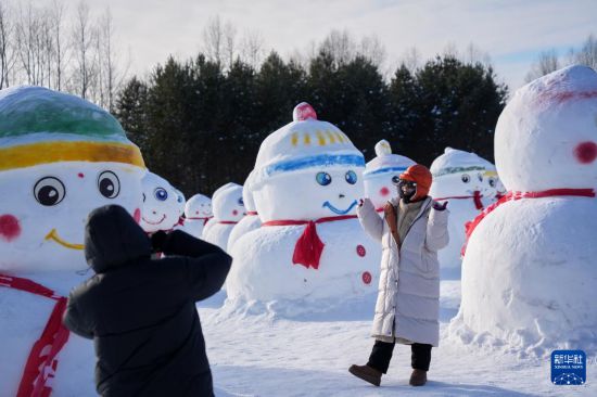 1月29日,游客在漠河北極村景區(qū)內(nèi)的北極沙洲與雪人“矩陣”合影。