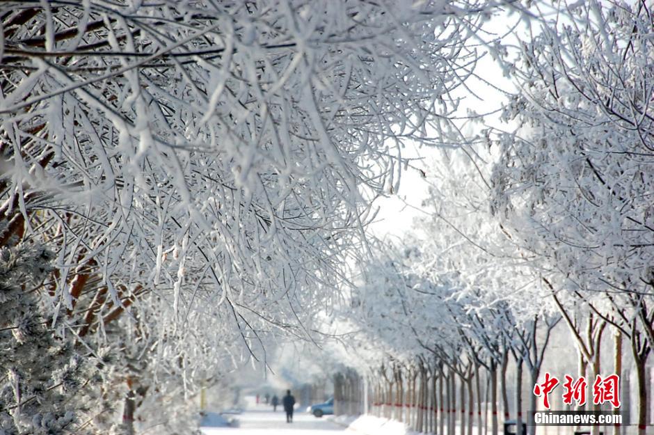 受寒潮低溫的影響,甘肅省玉門市城鄉(xiāng)近期普降中到大雪,寒流使這里大片的樹(shù)木上形成美麗的霧凇,十分壯觀,吸引眾多市民走出戶外欣賞美麗的霧凇美景。萬(wàn)宗平 攝