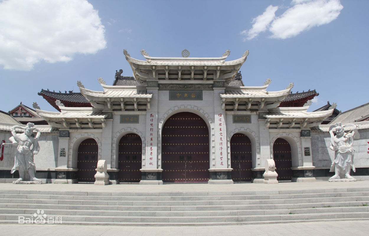 新建的普壽寺坐北面南,占地面積一萬九千九百八十八平方米。寺內(nèi)分為東西兩院,東院偌大,前面為非常秀麗的漢白玉牌樓,下層為青磚砌筑,上層為木構(gòu)建筑,單檐五脊頂,四出廊。山門正面額上嵌一書有「普壽寺」三字的石匾。西院一進(jìn)四個(gè)小四合院,第一為天王殿院,正面為天王殿,三開間,單檐歇山頂。殿內(nèi)正中置木龕,供石刻彌勒佛,背面供彩塑韋馱將軍,兩山間彩塑四大天王。天王殿兩側(cè)為鐘鼓二樓。東西樓二十四間,東配樓為客堂,墻上掛著名人字畫,其中有原中國佛教協(xié)會(huì)會(huì)長趙樸初書寫的一副對(duì)聯(lián)「恒順眾生究竟清涼普賢道,勤修梵行愿生安養(yǎng)壽僧祗」。