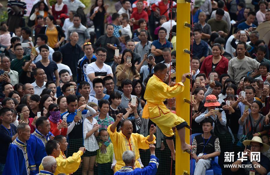 農(nóng)歷十月十五前后,福建西部武平縣各山村陸續(xù)進(jìn)入農(nóng)閑時(shí)節(jié)。按照當(dāng)?shù)仫L(fēng)俗,不同村子各自擇日舉辦民間活動(dòng),其中較有代表性的就是“上刀山”絕技。“上刀山”絕技在閩西山村流傳已有數(shù)百年歷史,表演者需光腳順著磨得鋒利閃亮的36把鋼刀,攀登至8米高的杉木柱子頂部,接受長(zhǎng)者祝福,祈求風(fēng)調(diào)雨順、五谷豐登。新華社記者 宋為偉 攝