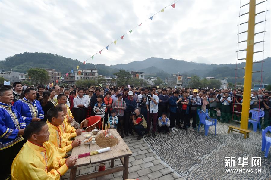 農(nóng)歷十月十五前后,福建西部武平縣各山村陸續(xù)進入農(nóng)閑時節(jié)。按照當(dāng)?shù)仫L(fēng)俗,不同村子各自擇日舉辦民間活動,其中較有代表性的就是“上刀山”絕技?!吧系渡健苯^技在閩西山村流傳已有數(shù)百年歷史,表演者需光腳順著磨得鋒利閃亮的36把鋼刀,攀登至8米高的杉木柱子頂部,接受長者祝福,祈求風(fēng)調(diào)雨順、五谷豐登。新華社記者 宋為偉 攝