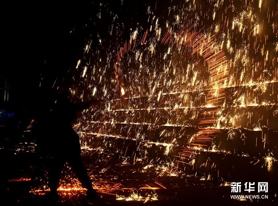 1月12日,河北磁縣開始舉行“打鐵花”慶新年活動(dòng)?!按蜩F花”是以小煉鐵爐將生鐵化成鐵水后,用木板將鐵水加鋸末打上天空,鋸末在空中燃燒形成“鐵花火雨”四濺飛揚(yáng)的景象。打鐵花”是當(dāng)?shù)貧v史悠久的民俗娛樂活動(dòng)。新華社發(fā) (趙鴻宇 攝)