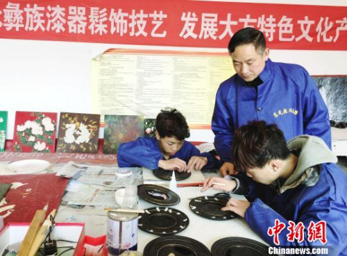 “大方彝族漆器髹飾技藝”貴州省級(jí)非遺代表性傳承人高光友指導(dǎo)學(xué)徒制作漆器。 從生漆收割、胎坯制作到漆器形成,全部50多道工序、80多個(gè)生產(chǎn)環(huán)節(jié),都需手工完成。其中,純大漆和皮胎等工藝是大方漆器所獨(dú)有。