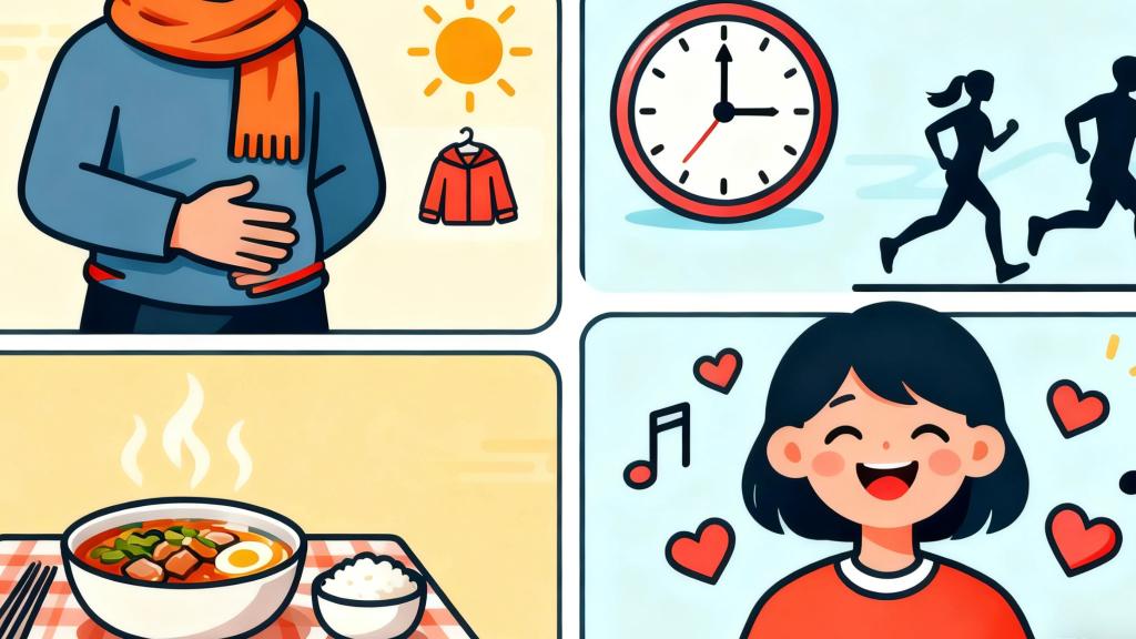 腹部保暖、三餐定時(shí)、規(guī)律作息、情緒管理是護(hù)胃“四大法寶”。AI繪圖??秋冬季如何打好“胃腸保護(hù)戰(zhàn)”?專家認(rèn)為,首先是做好腹部保暖,及時(shí)增添衣物,尤其要避免腹部暴露在冷空氣中,不要長(zhǎng)時(shí)間處于寒冷環(huán)境。其次,飲食要以溫?zé)嵋紫癁橹鳎M量不吃生冷食物,三餐定時(shí)定量,減少腸道負(fù)擔(dān)。第三,規(guī)律作息,避免熬夜,結(jié)合適當(dāng)體育鍛煉促進(jìn)血液循環(huán),增強(qiáng)胃腸蠕動(dòng),提高身體的耐寒能力和免疫力,以此增強(qiáng)胃腸抵抗力。最后,焦慮和抑郁是胃腸疾病的“催化劑”,要學(xué)會(huì)釋放壓力,保持心情愉悅,不讓壞情緒“傷”胃。