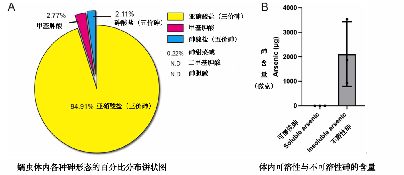 A:蠕蟲體內各種砷形態(tài)的百分比分布;B:體內可溶性與不可溶性砷的含量