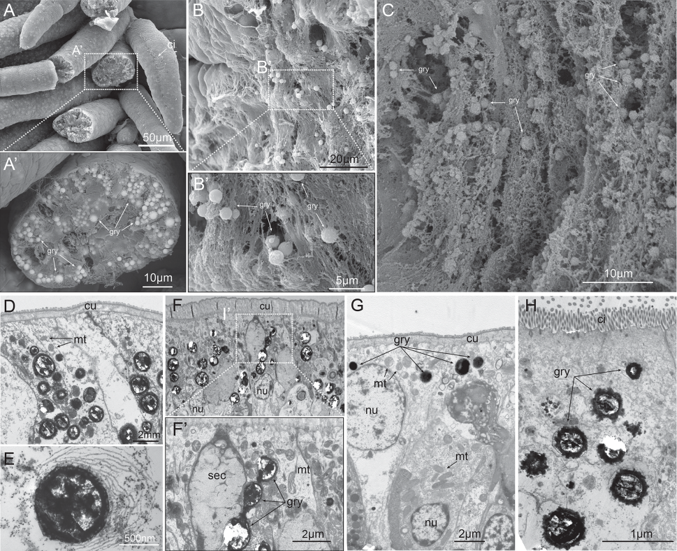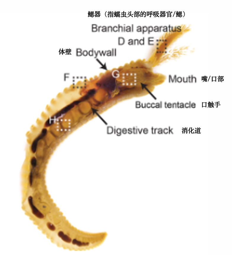 通過顯微鏡觀察,科學家發(fā)現蠕蟲的上皮細胞中充滿了直徑0.77-1.29微米的黃色顆粒。這些顆粒不僅存在于體表,還分布在鰓、口觸手和消化道中——所有與海水直接接觸的部位。