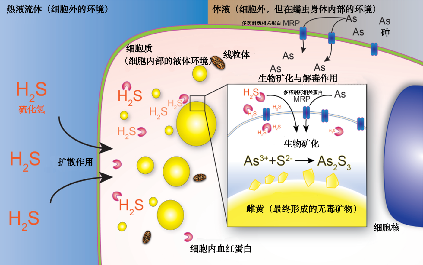 至此,兩種致命的毒物在“與世隔絕”的囊泡“反應倉”內相遇了。在這個由雙層脂質膜包裹的封閉空間里,環(huán)境被細胞精確調控:這里是還原性的、低溫的,且pH值接近中性。這些條件恰好是促進砷和硫化氫發(fā)生化學反應,形成穩(wěn)定、不溶于水的雌黃晶體的最佳環(huán)境。于是,兩種液態(tài)的、高活性、高毒性的物質,就此結合成了一種固態(tài)的、惰性的、相對無害的礦物。毒性被永久地“鎖定”在了晶體結構中。