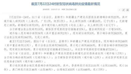 人民網(wǎng)北京7月23日電(董童)國(guó)家衛(wèi)生健康委于今日在官網(wǎng)發(fā)布的《截至7月22日24時(shí)新型冠狀病毒肺炎疫情最新情況》(以下簡(jiǎn)稱“情況”)提出,7月22日0—24時(shí),31個(gè)省(自治區(qū)、直轄市)和新疆生產(chǎn)建設(shè)兵團(tuán)報(bào)告新增確診病例22例,其中境外輸入病例3例(上海1例,廣東1例,陜西1例),本土病例19例(新疆18例,遼寧1例);無(wú)新增死亡病例;新增疑似病例3例,其中境外輸入病例2例(均在上海),本土病例1例(在遼寧)。當(dāng)日新增治愈出院病例15例,解除醫(yī)學(xué)觀察的密切接觸者378人,重癥病例較前一日增加5例。