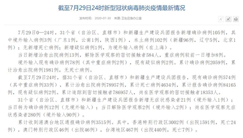 情況顯示,截至7月29日24時,據(jù)31個省(自治區(qū)、直轄市)和新疆生產(chǎn)建設(shè)兵團(tuán)報告,現(xiàn)有確診病例574例(其中重癥病例33例),累計治愈出院病例78957例,累計死亡病例4634例,累計報告確診病例84165例,現(xiàn)有疑似病例2例。累計追蹤到密切接觸者786957人,尚在醫(yī)學(xué)觀察的密切接觸者18353人。