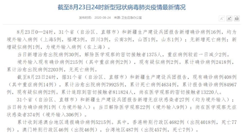 人民網(wǎng)北京8月24日電(董童)國(guó)家衛(wèi)生健康委于今日在官網(wǎng)發(fā)布的《截至8月23日24時(shí)新型冠狀病毒肺炎疫情最新情況》(以下簡(jiǎn)稱“情況”)提出,8月23日0—24時(shí),31個(gè)?。ㄗ灾螀^(qū)、直轄市)和新疆生產(chǎn)建設(shè)兵團(tuán)報(bào)告新增確診病例16例,均為境外輸入病例(上海5例,福建3例,四川3例,云南3例,山西1例,山東1例);無(wú)新增死亡病例;新增疑似病例1例,為境外輸入病例(在上海)。當(dāng)日新增治愈出院病例30例,解除醫(yī)學(xué)觀察的密切接觸者1375人,重癥病例較前一日減少2例。