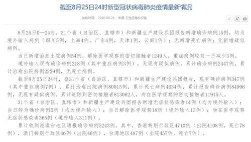 情況顯示,截至8月25日24時,據(jù)31個?。ㄗ灾螀^(qū)、直轄市)和新疆生產(chǎn)建設(shè)兵團報告,現(xiàn)有確診病例347例(其中重癥病例7例),累計治愈出院病例80015例,累計死亡病例4634例,累計報告確診病例84996例,無現(xiàn)有疑似病例。累計追蹤到密切接觸者813062人,尚在醫(yī)學觀察的密切接觸者11915人。