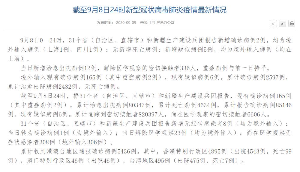 情況顯示,截至9月8日24時,據(jù)31個省(自治區(qū)、直轄市)和新疆生產(chǎn)建設(shè)兵團報告,現(xiàn)有確診病例165例(其中重癥病例2例),累計治愈出院病例80347例,累計死亡病例4634例,累計報告確診病例85146例,現(xiàn)有疑似病例6例。累計追蹤到密切接觸者820397人,尚在醫(yī)學(xué)觀察的密切接觸者6606人。