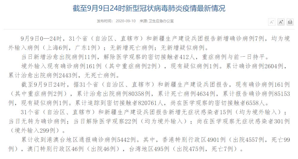 人民網(wǎng)北京9月10日電(董童)國家衛(wèi)生健康委于今日在官網(wǎng)發(fā)布的《截至9月9日24時新型冠狀病毒肺炎疫情最新情況》(以下簡稱“情況”)提出,9月9日0—24時,31個?。ㄗ灾螀^(qū)、直轄市)和新疆生產(chǎn)建設(shè)兵團(tuán)報告新增確診病例7例,均為境外輸入病例(上海6例,廣東1例);無新增死亡病例;無新增疑似病例。當(dāng)日新增治愈出院病例11例,解除醫(yī)學(xué)觀察的密切接觸者412人,重癥病例與前一日持平。