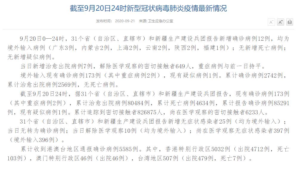 | 國家衛(wèi)健委:9月20日新增確診病例12例 均為境外輸入病例 |