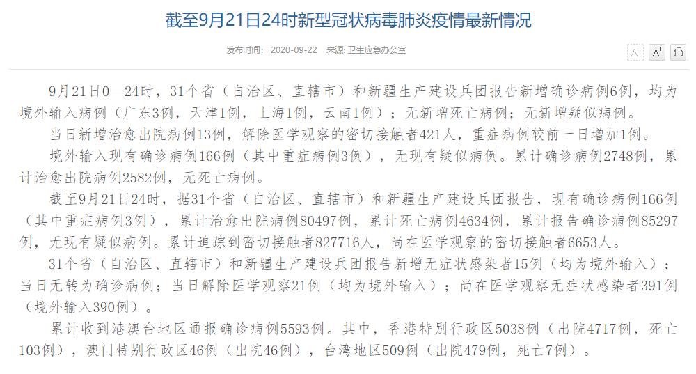 情況顯示,截至9月21日24時,據(jù)31個省(自治區(qū)、直轄市)和新疆生產(chǎn)建設(shè)兵團報告,現(xiàn)有確診病例166例(其中重癥病例3例),累計治愈出院病例80497例,累計死亡病例4634例,累計報告確診病例85297例,無現(xiàn)有疑似病例。累計追蹤到密切接觸者827716人,尚在醫(yī)學(xué)觀察的密切接觸者6653人。