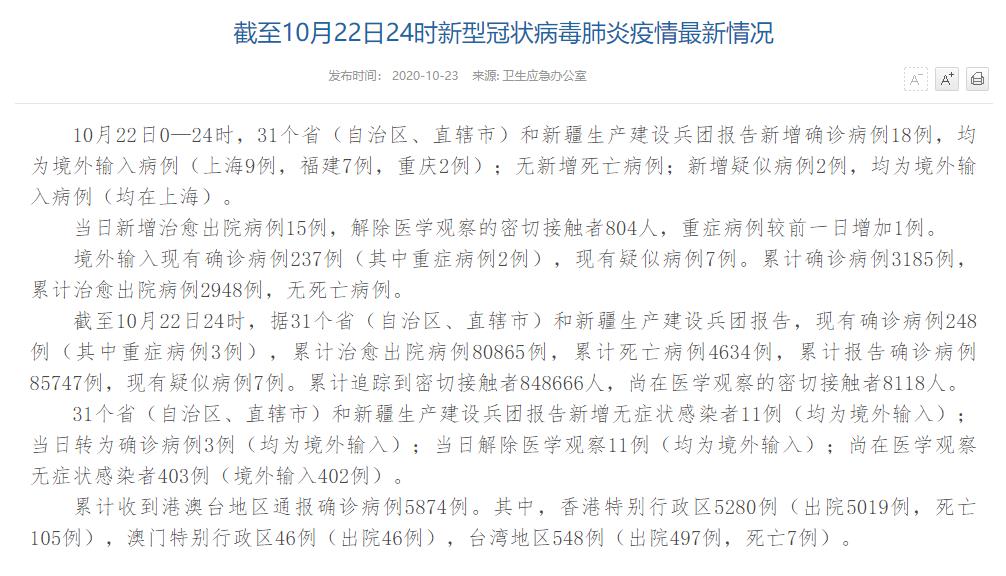 人民網(wǎng)北京10月23日電(董童)國(guó)家衛(wèi)生健康委于今日在官網(wǎng)發(fā)布的《截至10月22日24時(shí)新型冠狀病毒肺炎疫情最新情況》(以下簡(jiǎn)稱“情況”)提出,10月22日0—24時(shí),31個(gè)省(自治區(qū)、直轄市)和新疆生產(chǎn)建設(shè)兵團(tuán)報(bào)告新增確診病例18例,均為境外輸入病例(上海9例,福建7例,重慶2例);無新增死亡病例;新增疑似病例2例,均為境外輸入病例(均在上海)。當(dāng)日新增治愈出院病例15例,解除醫(yī)學(xué)觀察的密切接觸者804人,重癥病例較前一日增加1例。