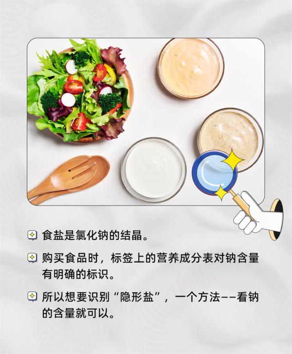 日常飲食要控鹽。有些食品嘗起來并不咸,但含鹽量卻相當(dāng)高,因?yàn)楹胁簧佟半[形鹽”。食鹽是氯化鈉的結(jié)晶,購買食品時,標(biāo)簽上的營養(yǎng)成分表對鈉含量有明確的標(biāo)識。所以想要識別“隱形鹽”,可以看標(biāo)簽上鈉的含量。(來源:科普中國)