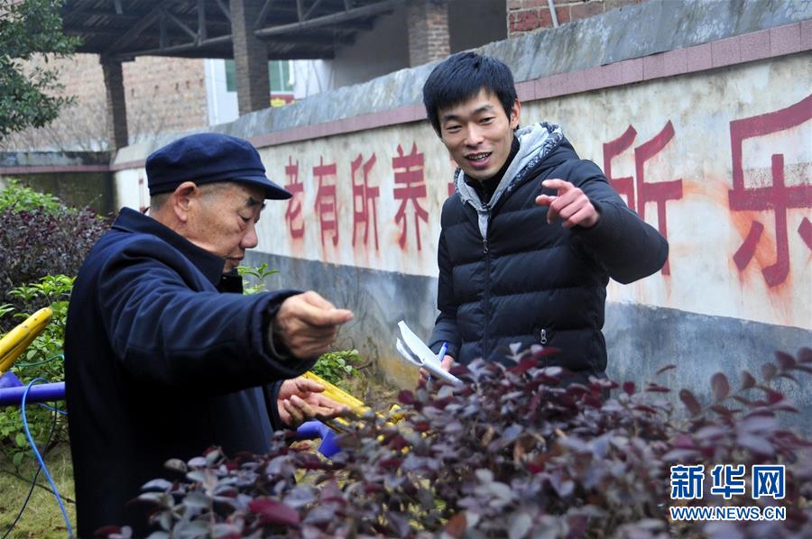 2013年1月15日,在湖南省衡山縣賀家山村,畢業(yè)于美國耶魯大學(xué)的大學(xué)生村官秦玥飛(右)和當(dāng)?shù)鼐蠢显涸洪L交談。新華社記者 周勉 攝