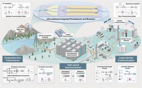 為此,北京大學聯(lián)合鵬城實驗室、上海科技大學、國家信息光電子創(chuàng)新中心等研發(fā)團隊,創(chuàng)出“光纖—無線一體化融合通信”概念,并采用集成光學方案,成功研制出250GHz(千兆赫茲)以上超寬帶集成光子器件。在此基礎上開發(fā)出的新系統(tǒng)實現(xiàn)了光纖通信單通道512Gbps(千兆比特每秒)信號傳輸、無線通信單通道400Gbps信號傳輸。