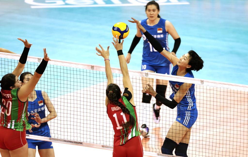 9月17日,中國隊球員袁心玥(右一)在比賽中扣球。當(dāng)日,在浙江省寧波市舉行的巴黎奧運(yùn)會女排資格賽A組比賽中,中國隊以3:0戰(zhàn)勝墨西哥隊。新華社記者 陳斌 攝